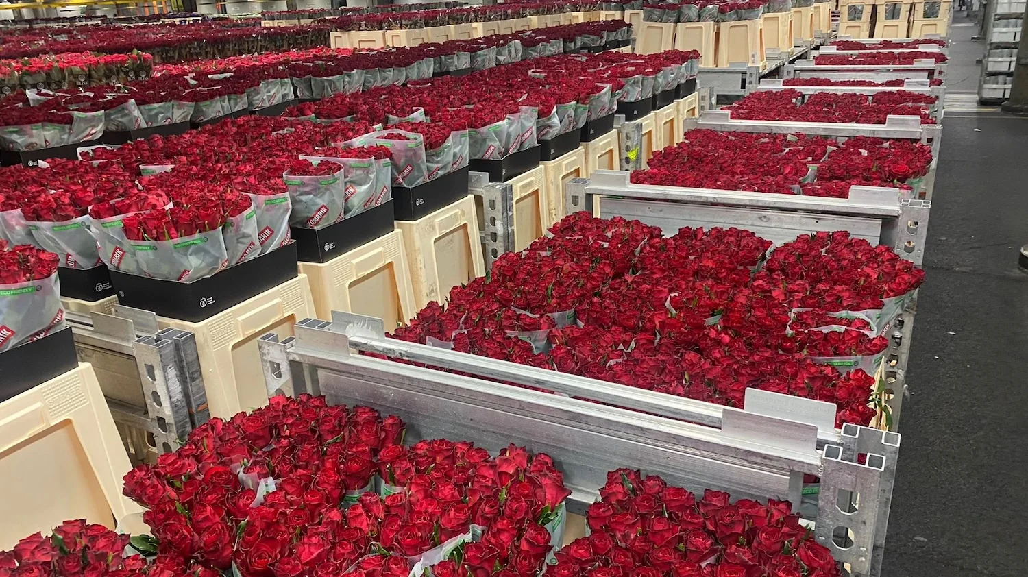 As soon as the roses arrive in the Netherlands from Kenya on a temperature-controlled flight, they are received by our freight agent and immediately transported to our location in Aalsmeer. A carefully planned and efficient production process ensures the daily processing of the roses. They are repackaged from transport boxes onto auction trolleys, making them ready for sale the next day.